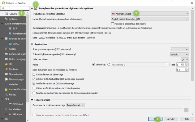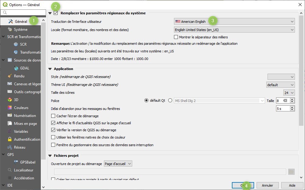 Passer QGIS en anglais⚓Description⚓Cette méthode vous montre comment passer l'interface de QGIS en anglais.Emplacement⚓Menu Préférences / OptionsDans l'onglet « Général »Activez « Remplacer les paramètres régionaux du système »Sélectionnez « American English »ValidezAttention - Redémarrez QGIS pour prendre la modification en compte.⚓