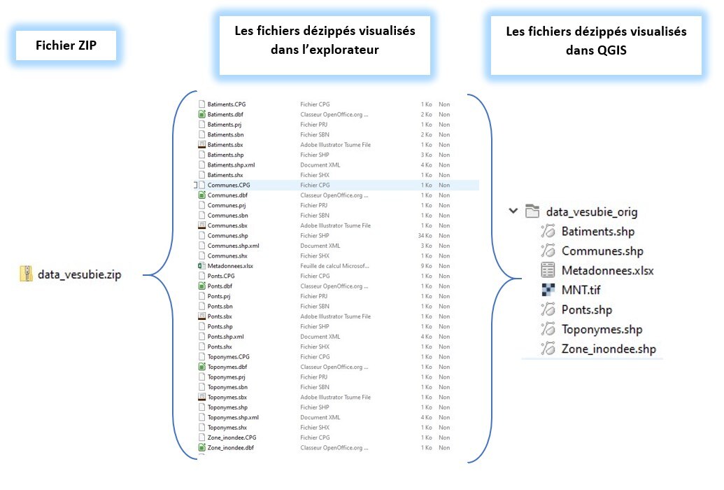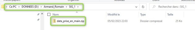 Les données SIG sont constitués d'un ensemble de fichiers. Pour faciliter leur manipulation, les jeux de données sont généralement fournis au format ZIP. Il s'agit d'un format qui compresse les données et permet de gérer le jeu de données en 1 seul fichier.